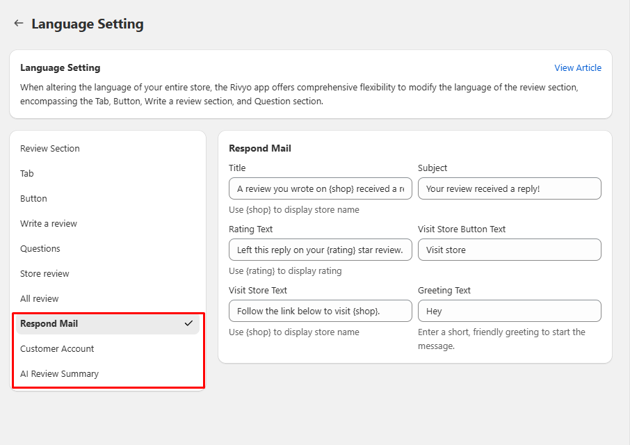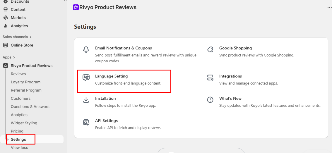 The Language Settings feature allows you to customize the app’s text so it matches your store’s language. Using this option, you can translate or modify the text for the Review Section, Tabs, Buttons, Write a Review form, Question/Answer section, and more.