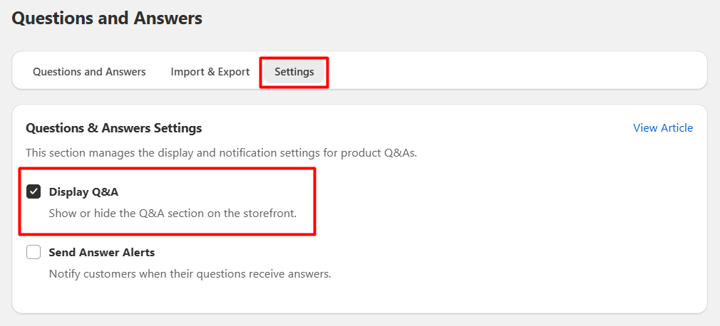 - Now, click on the "Settings" option and then select "Display Q&A" to enable the question and answer section in your store.