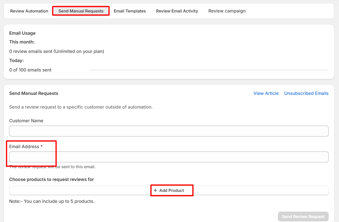 Step 2: Locate the tab labeled Send Manual Request. Enter your customers email address and select the products for which you wish to send a feedback request email. Then, click on the Send Review Request button to send the email.