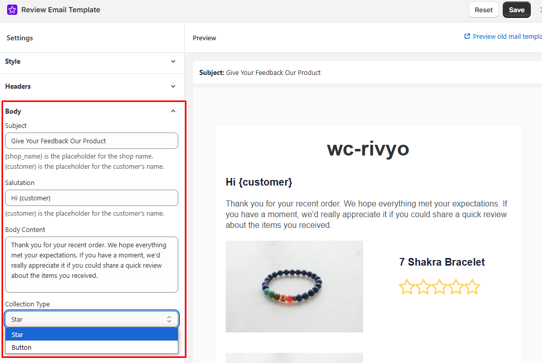 - Collection Type: Select whether you would prefer to display a star or a button in the email for collecting reviews. Both options will redirect the customer to your store's product page with a review form open, facilitating the submission of reviews.