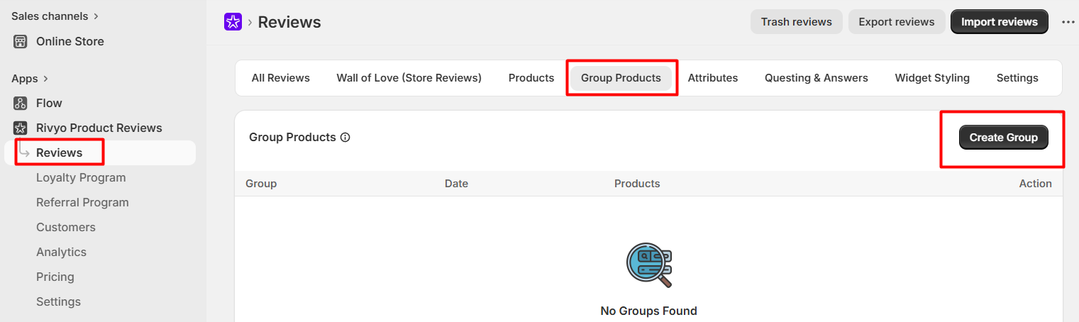 1. Go to the App admin >> Reviews >> Group Product tab >> and click on the "Create Group".