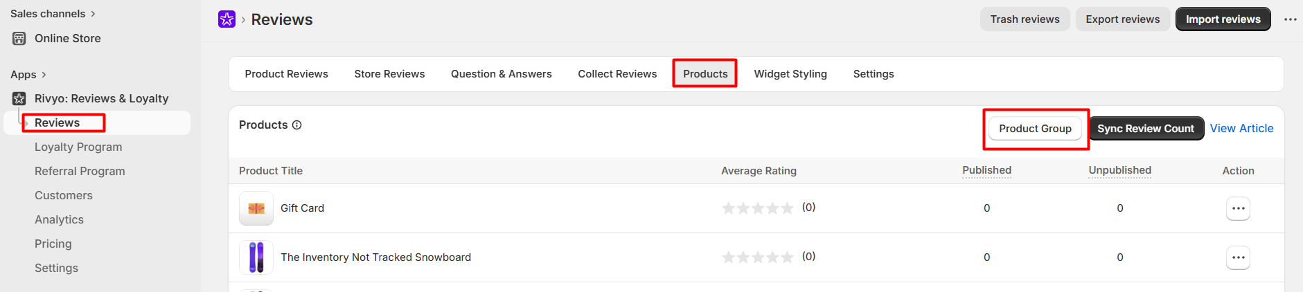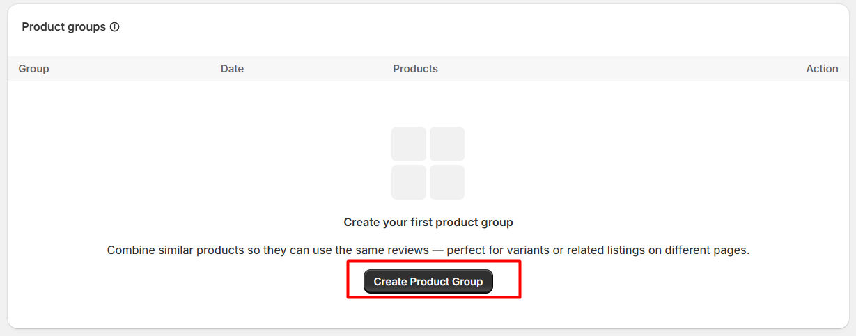 1. Go to the App admin >> Reviews >> Products tab >> Click on button Product Group >> and click on the "Create Group".