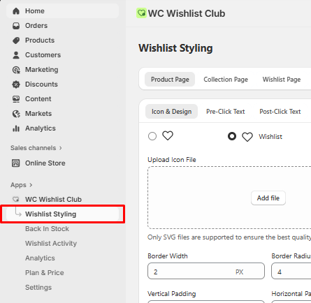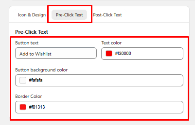 Click on the Pre-Click Text and Customize the Wishlist Button text, text colour, background colour, and border colour before adding the wishlist.