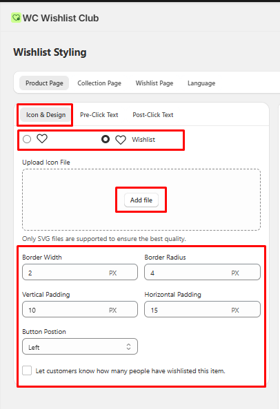 - Customize the wishlist button border & its radius, Add Top, Bottom, Right, and Left padding, and also set the button position.