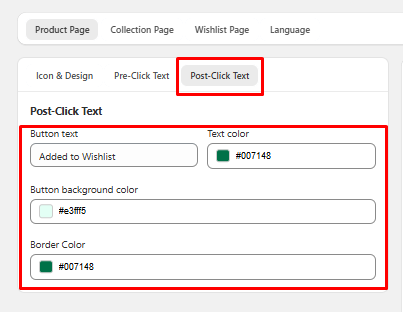 Click on the Post-Click Text and Customize the Wishlist Button text, text colour, background colour, and border colour after adding the wishlist.
