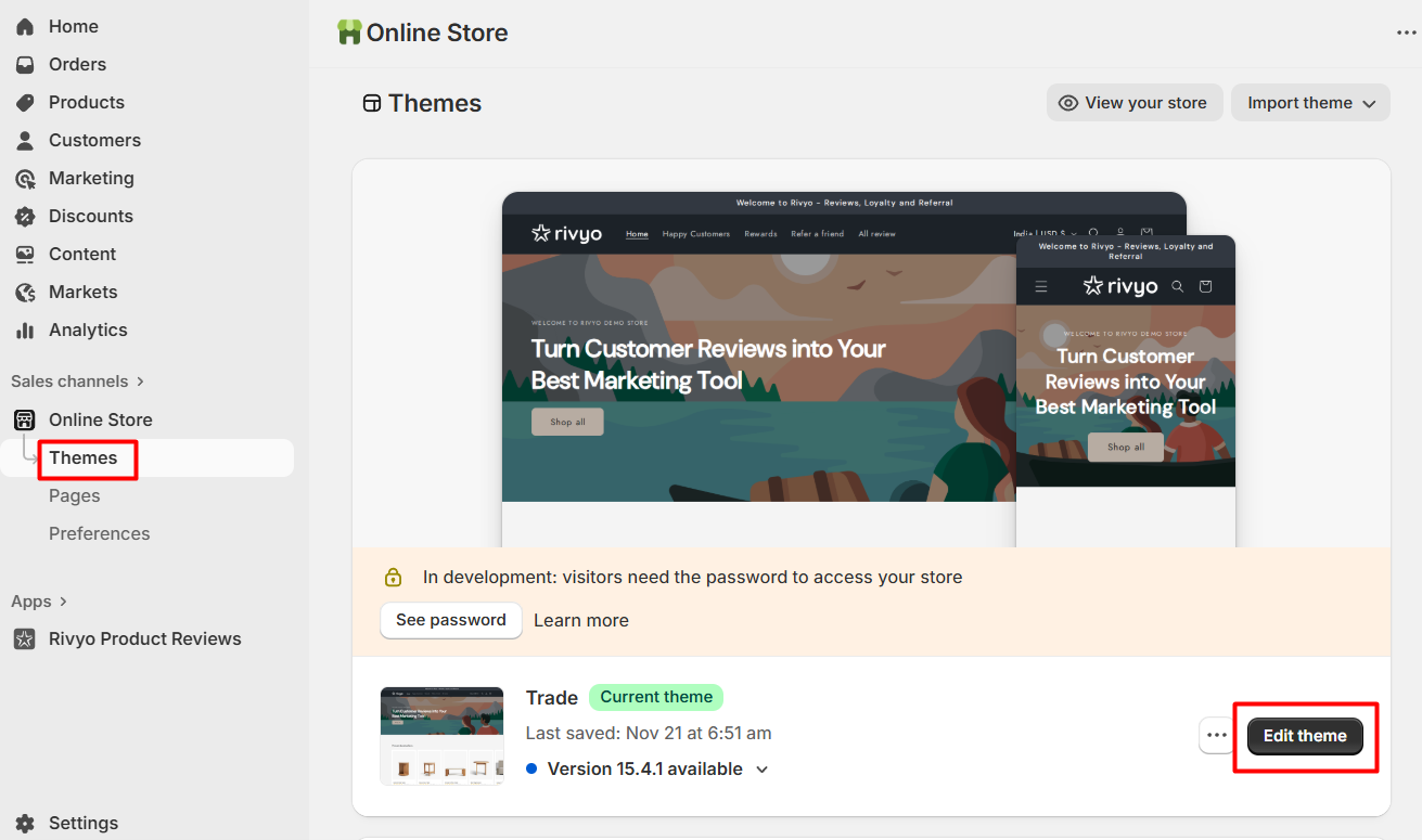- Navigate to Online Store >> Themes >> Click on the "Edit Theme" button