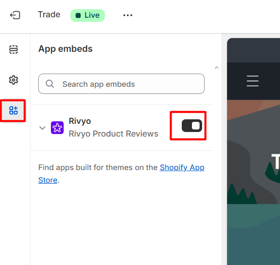 - Find "Rivyo" within the list of available app embeds. Toggle the switch to the "on" or "enabled" position.