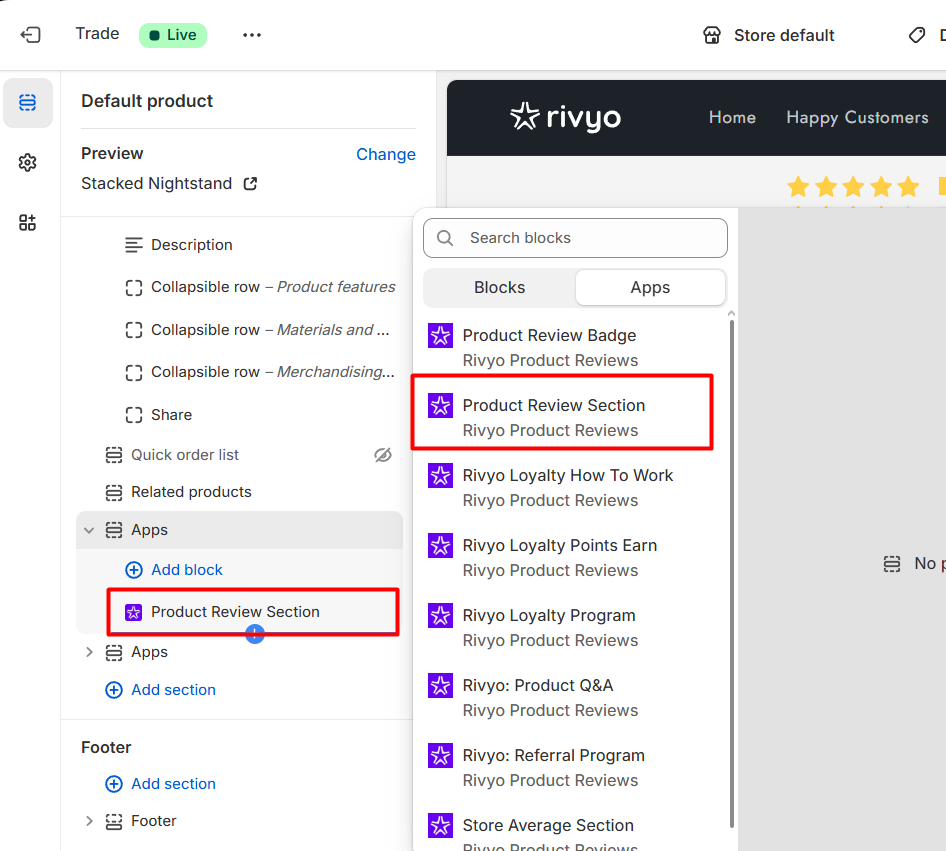 Step 2 : Add the Rivyo Product Reviews app to your theme by click on add block button.