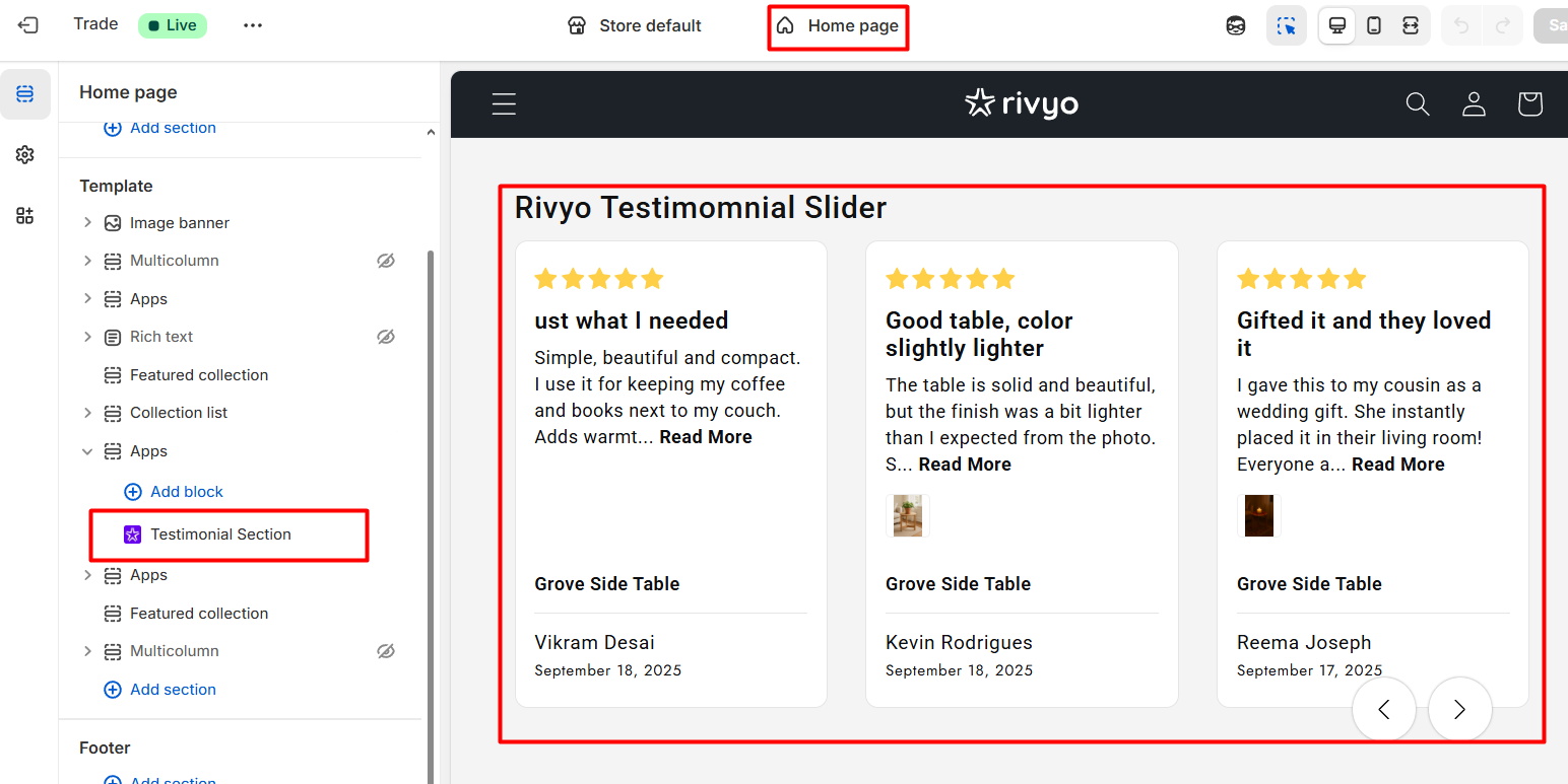 Similarly, you can add the Product Review Section on the product template. Once you add, click on the Save button.