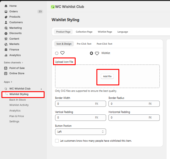 - Go to Wishlist Styling >> Upload Icon file >> Select Icon