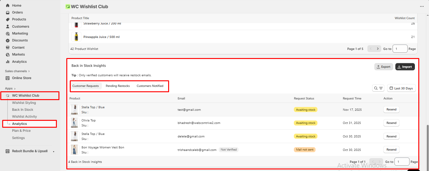 - Customer Requests:- It will display the list of all customers who have clicked on the "Notify Me" button from the product page or collection page.