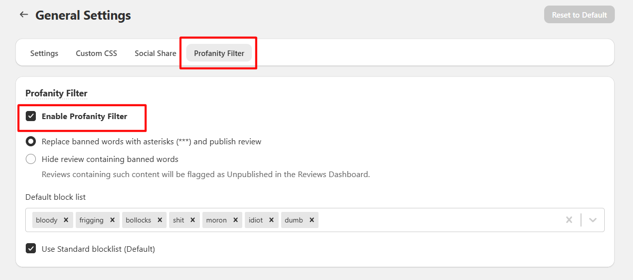 Step 3: Select the Profanity Filter Tab and Enable the Profanity Filter