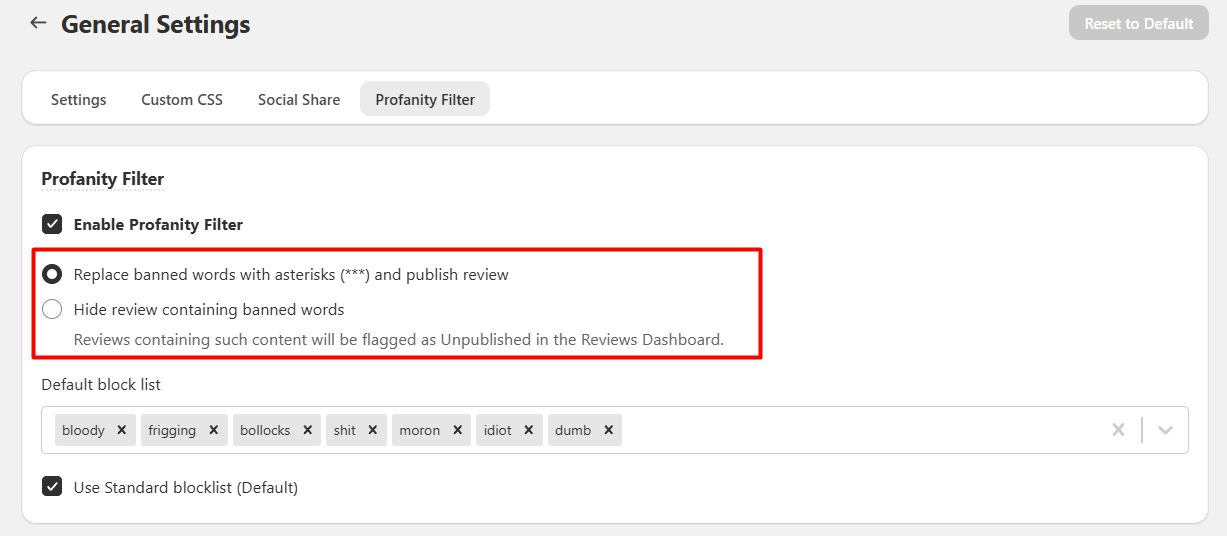 - You can customize or enhance the default blocklist to fit your specific needs by unchecking the above option. This will enable you to add your own words as profanity