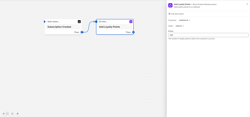 Enhance your subscription model and reward your customers for every new subscription with loyalty points. This guide outlines the steps to configure a custom action in Rivyo Loyalty and set up a corresponding workflow in Shopify Flow.