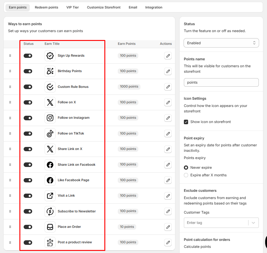 Customers can earn points through a variety of actions that you enable for your store in the loyalty program: