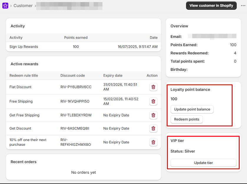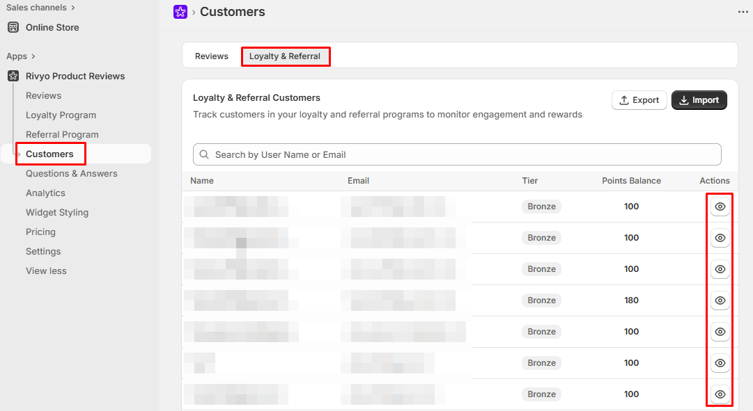 - View all loyalty and referral members here. Use the eye icon under "Actions" to see the details and manage their points and tiers.